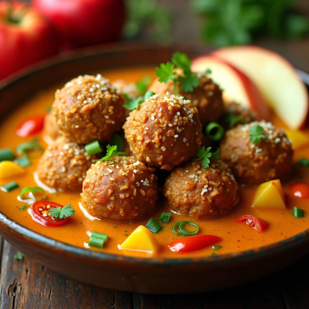 Leckere Hackfleischbällchen in einer aromatischen Currysauce serviert.