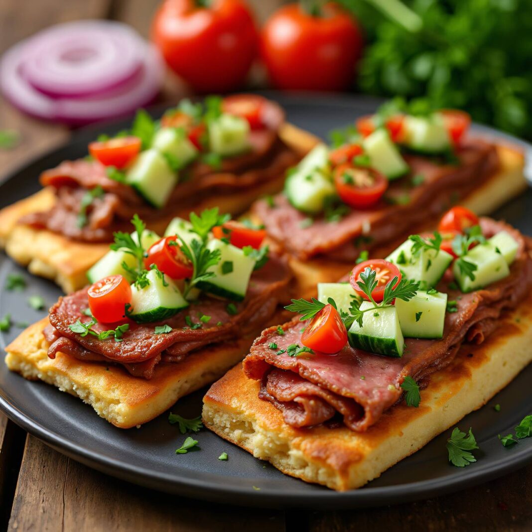 Leckere Hackfleischfladen mit frischem Gemüsebelag, perfekt für ein schnelles und sättigendes Gericht.