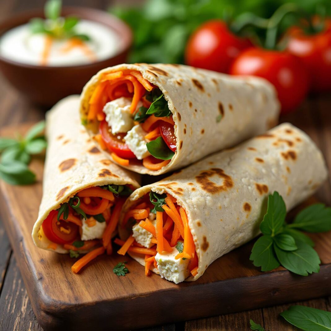 Leckere Wraps aus Haferflocken gefüllt mit einer frischen Gemüse-Frischkäse-Mischung und einer würzigen Sauce.
