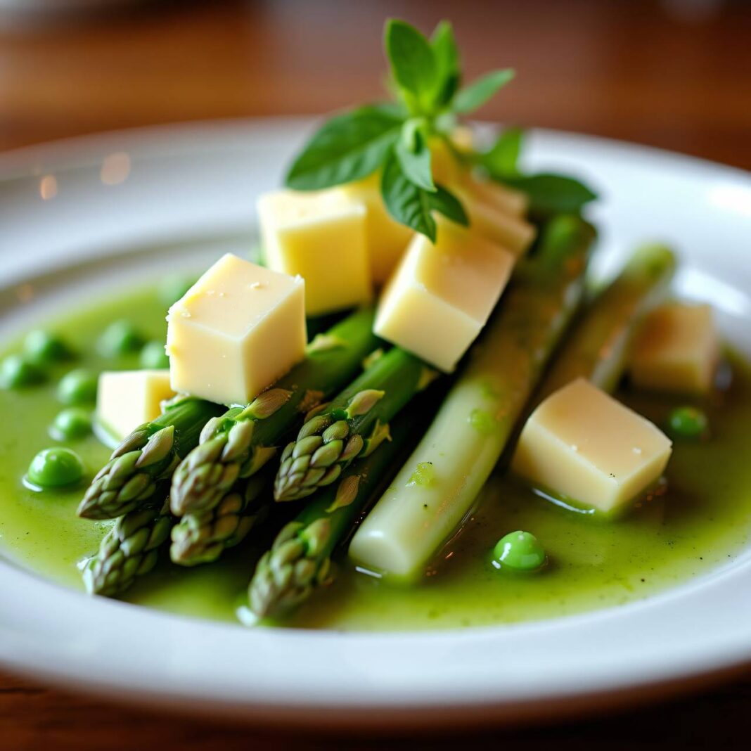 Ein köstliches Gericht mit halbgeschmolzenem Reblochon, frischen Spargeln und einem aromatischen Erbsen-Dressing.