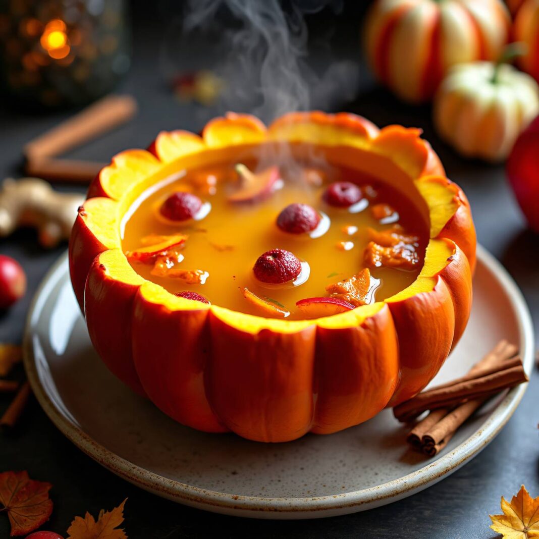 Ein köstlicher Halloween-Punsch, ideal für die gruselige Jahreszeit, serviert im ausgehöhlten Hokkaido-Kürbis.
