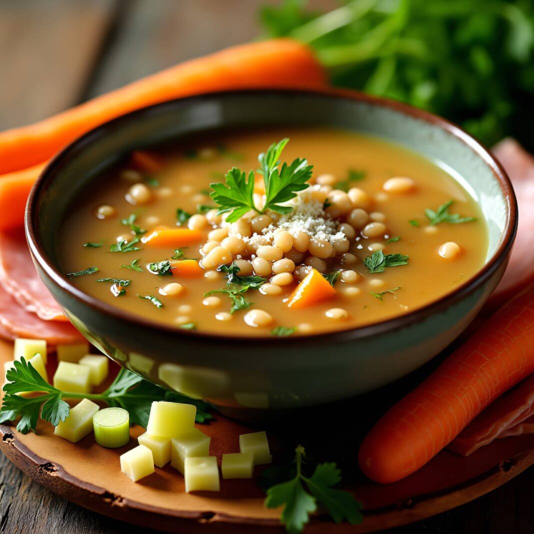 Ein klassisches Rezept für Hochzeitssuppe mit Rollgerste, angereichert mit Gemüse, Speck und Rohschinken.