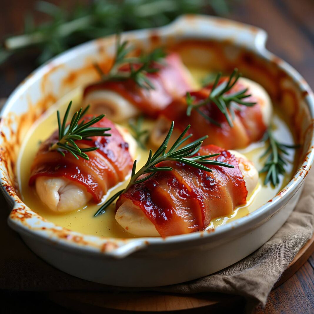 Ein köstliches Rezept für Hühnerbrustfilets, gefüllt mit Holunderbeeren und umwickelt mit Speck, perfekt für ein besonderes Abendessen.