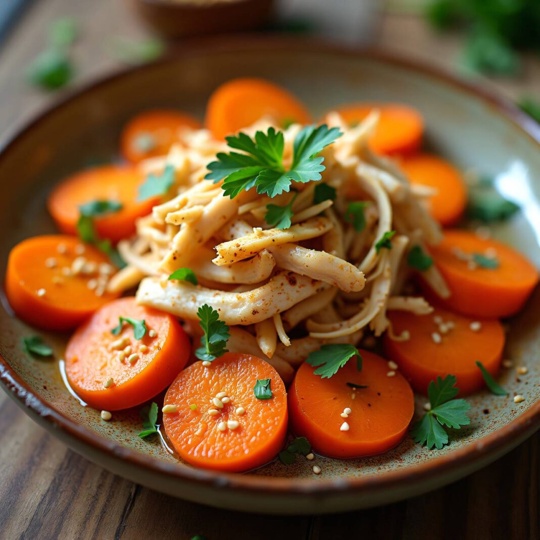 Anrichten: Die Karotten auf vorgewärmte Teller geben, die Hühnerstücke darauf anrichten und nach Belieben mit Koriandergrün garnieren. Sofort servieren.
