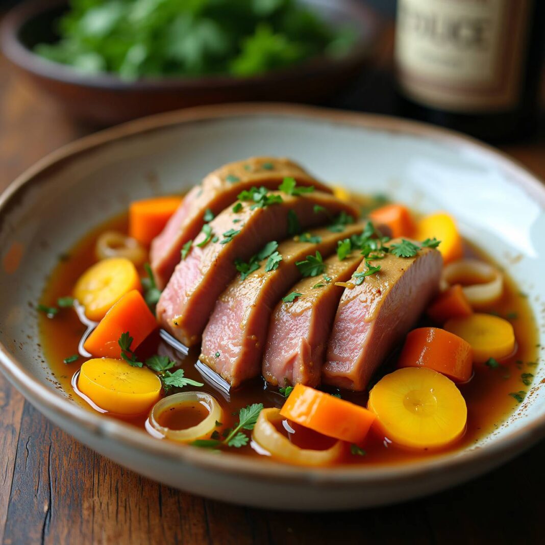 Ein herzhaftes Gericht aus zarten Kalbsbrustschnitten, verfeinert mit Honig und Senf, serviert auf einem Bett aus geschmorten Karotten.