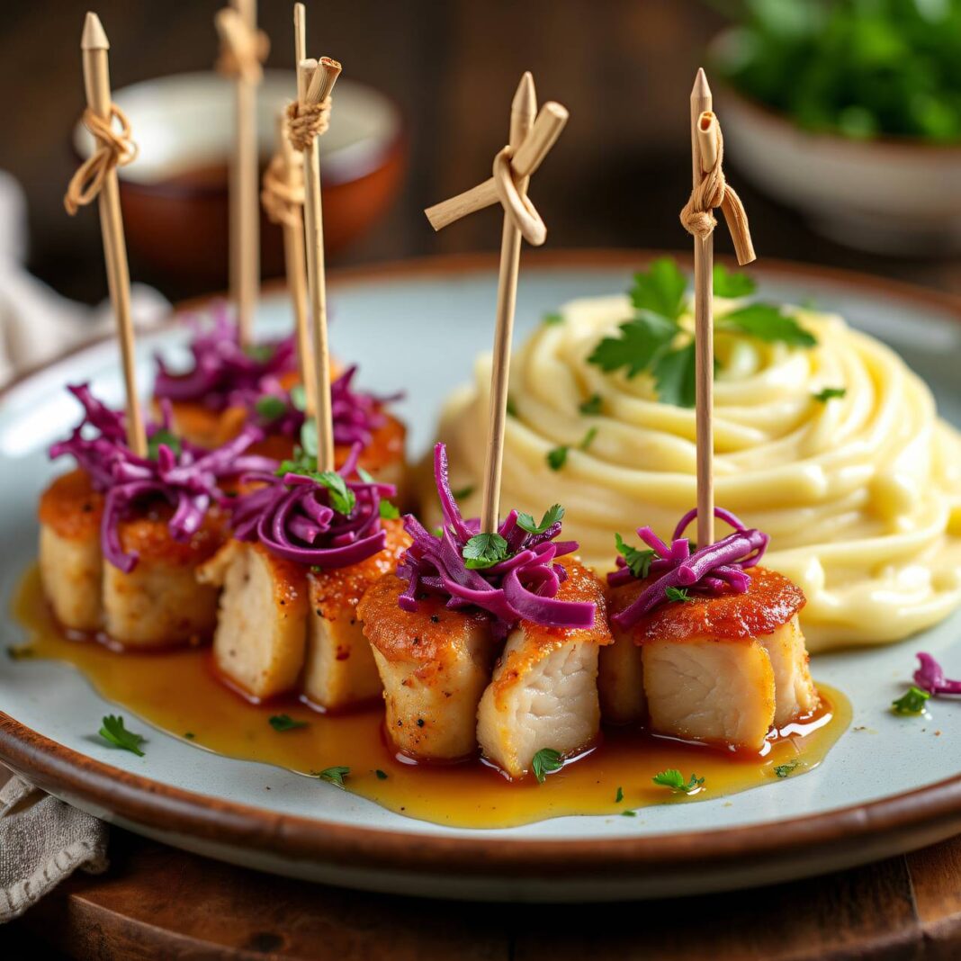 Ein köstliches Rezept für zarte Hühnerblüten, serviert mit cremigem Kartoffelpüree und einer feinen Sauce.