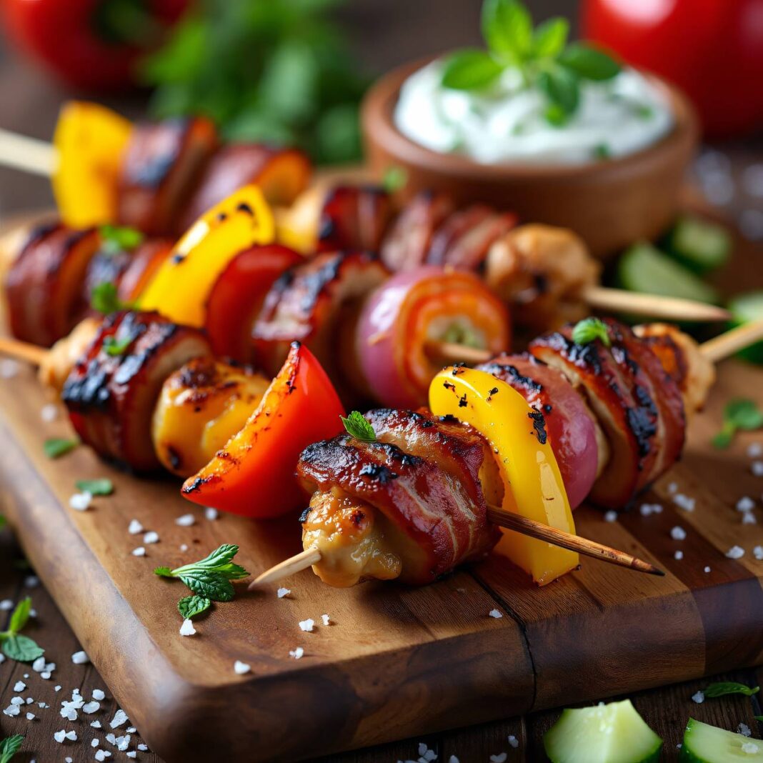 Leckere Hühner-Gemüsespiesschen, serviert mit erfrischendem Tzatziki.