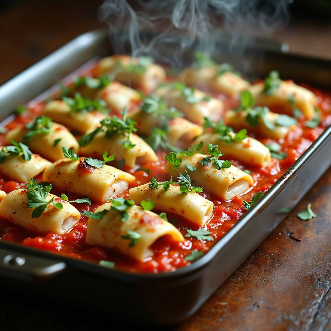 - Decke die Form ab und backe die Wickel in der Mitte des auf 200°C vorgeheizten Ofens für 15-20 Minuten. Entferne in den letzten 10 Minuten den Deckel, damit die Wickel schön bräunen.