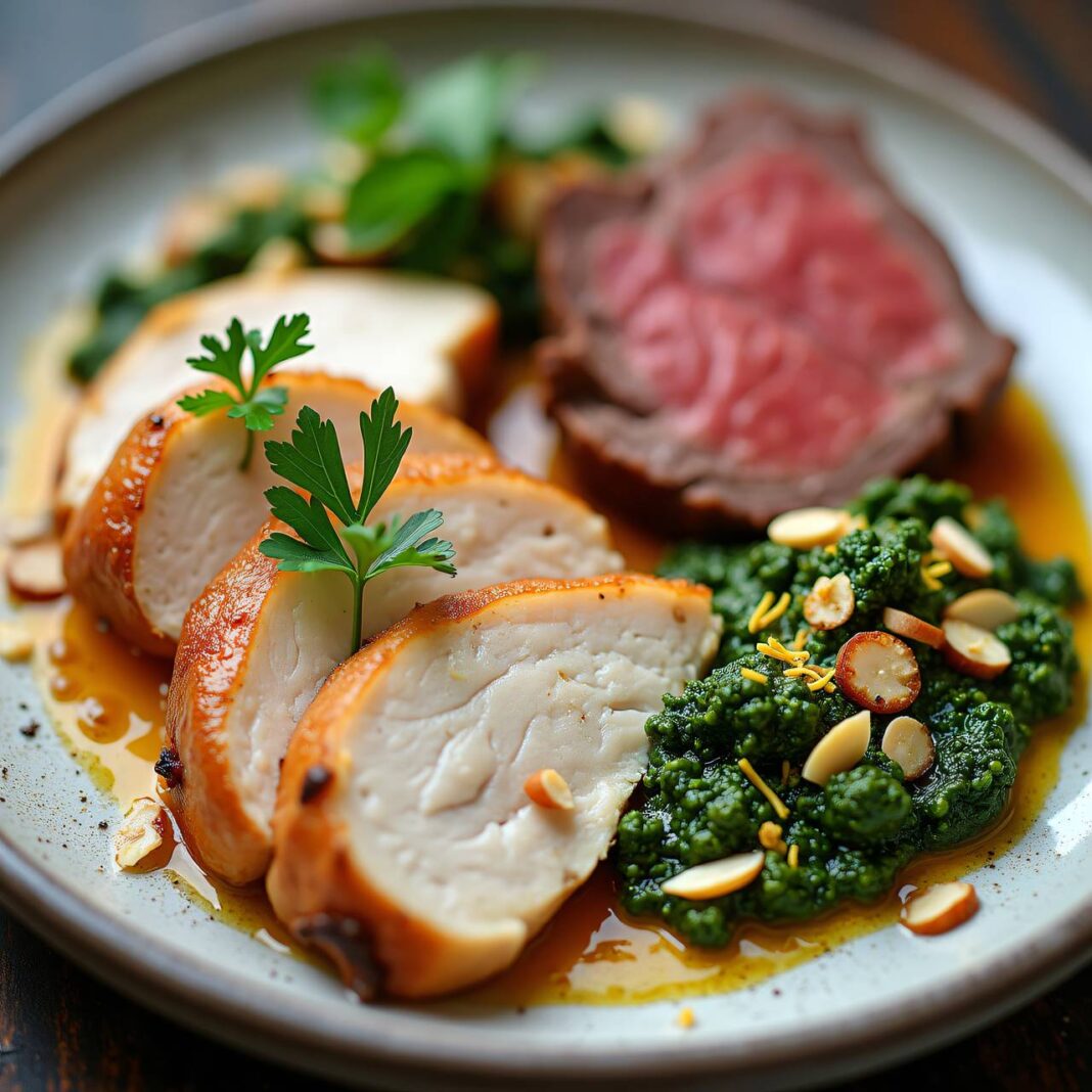 Ein köstliches Rezept mit zartem Hühnerbrustfilet und Roastbeef, serviert mit zwei verschiedenen Pestos aus Petersilie und Zitronenmelisse.