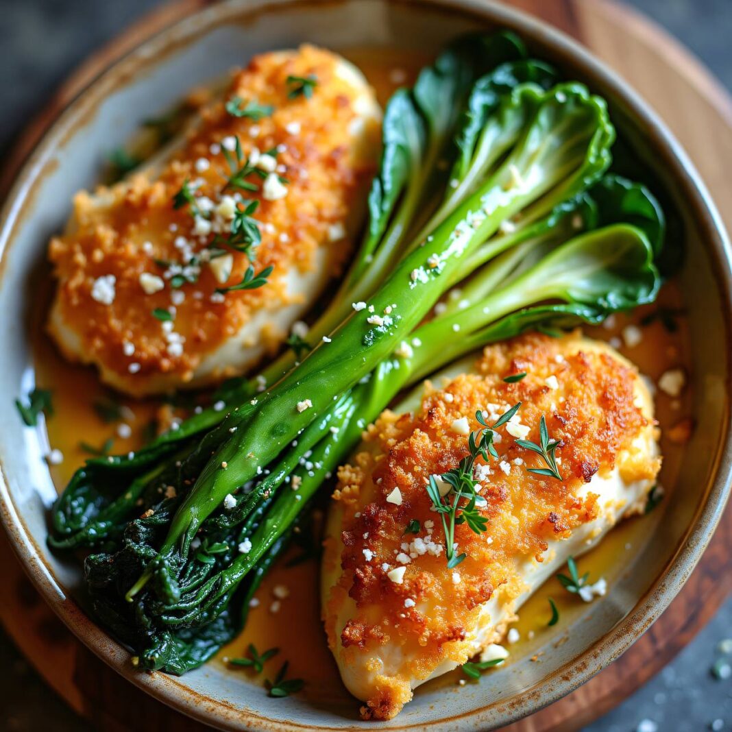 Ein köstliches Gericht aus Hühnerbrust mit einer knusprigen Käsekruste, begleitet von Mandel-Pak-Choi.