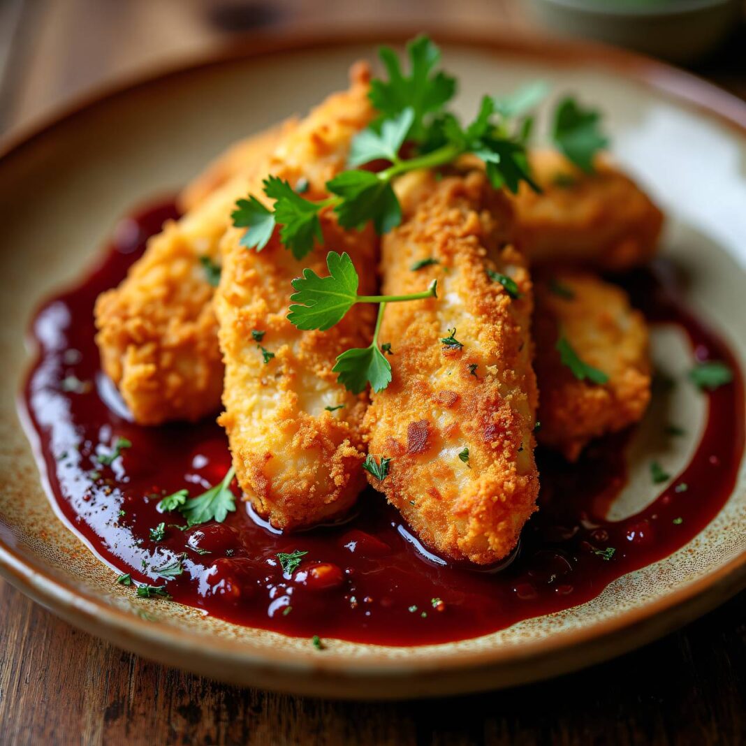 Anrichten: Auf vorgewärmten Tellern jeweils etwas von der Schalotten-Sauce anrichten. Je 3-4 Hühnerstreifen darauflegen und nach Belieben mit Petersilie garnieren. Die restliche Sauce separat servieren.