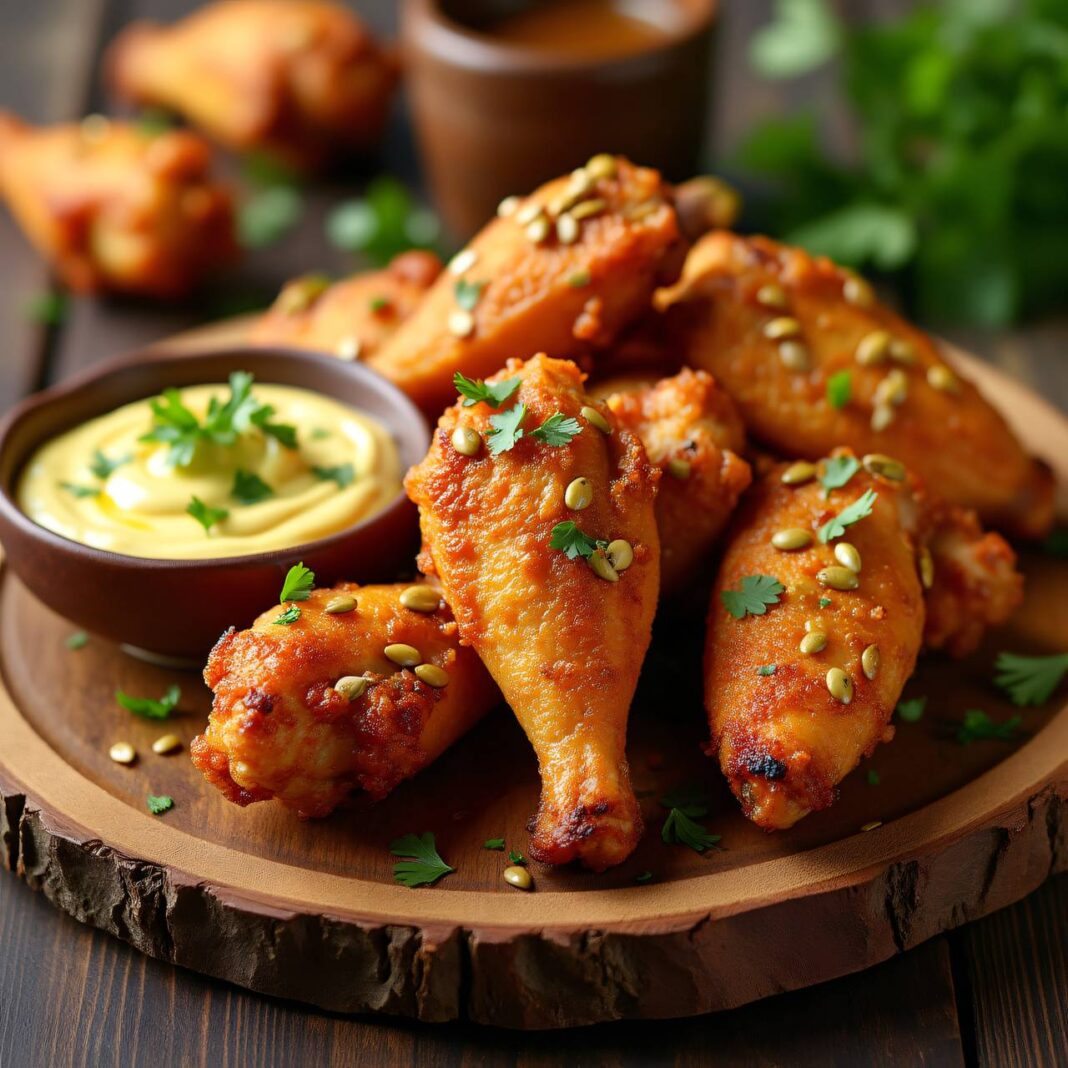 Ein leckeres Rezept für Hühnerflügel, die in einem aromatischen Senfschaum-Dip serviert werden.