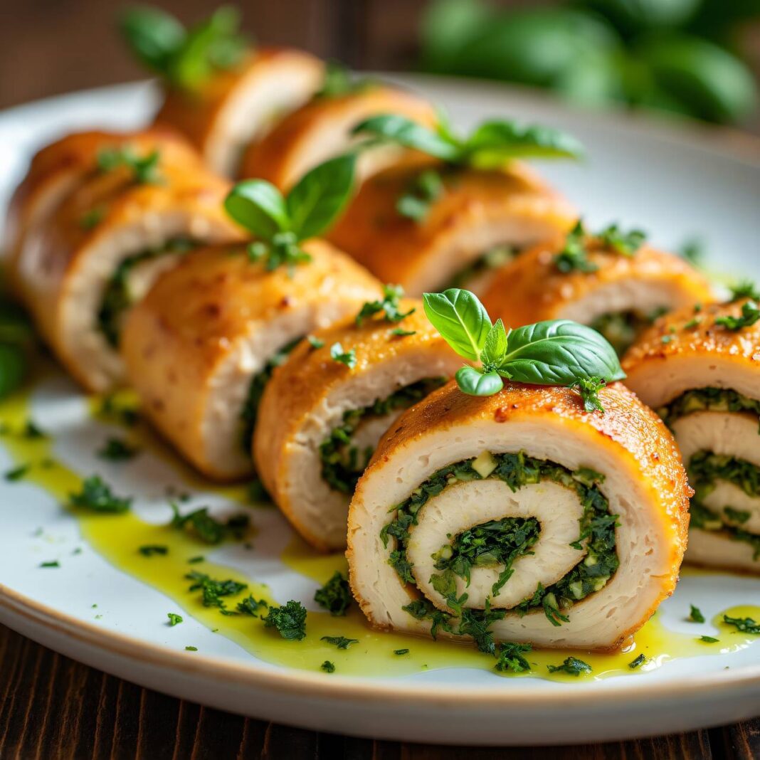 Zarte Hühnerröllchen gefüllt mit einer köstlichen Mandel-Zitronenfüllung, serviert an einer aromatischen Basilikumsauce.