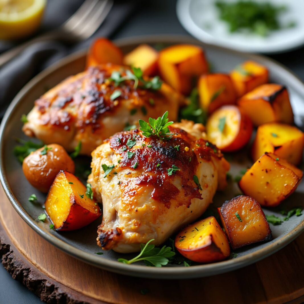 - Die Hühnerschenkel, Kartoffeln und Kürbisstücke auf Tellern anrichten und servieren.