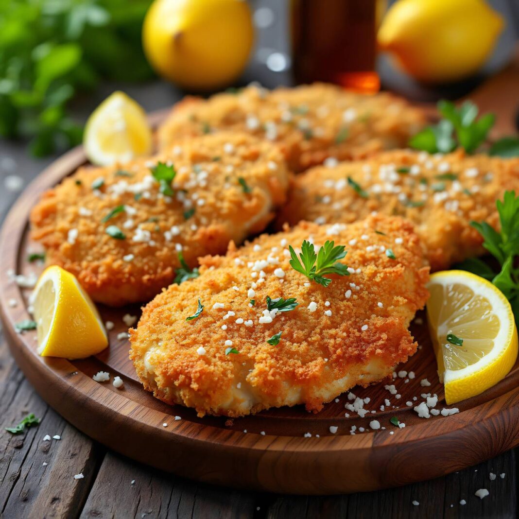 Ein köstliches Hühnerschnitzel, paniert in einer knusprigen Käsekruste, serviert mit frischen Zitronenschnitzen.