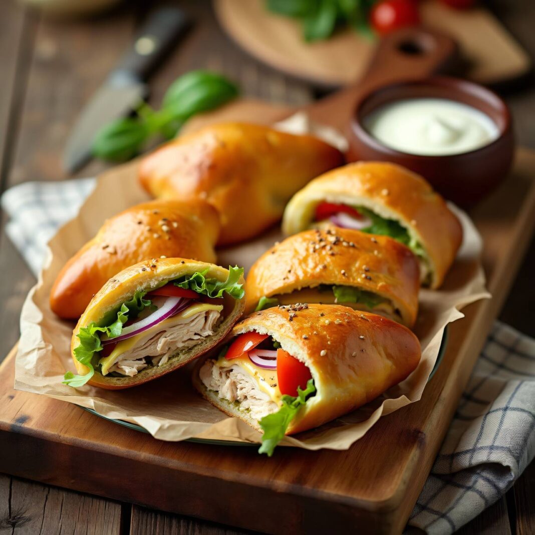 Leckere Hühnertaschen gefüllt mit zartem Hühnerfleisch, frischem Salat und Käse, perfekt für ein schnelles Mittagessen oder einen Snack.