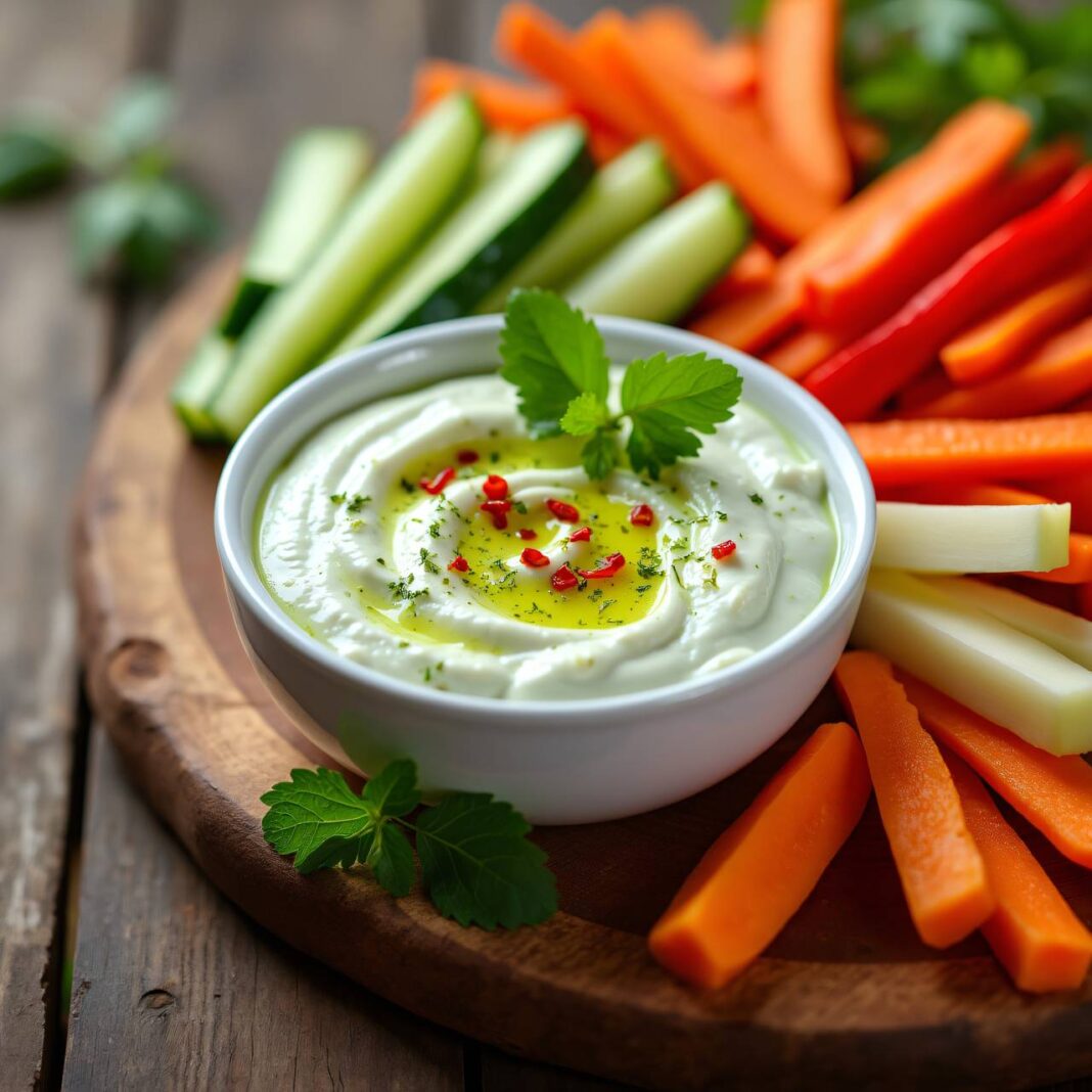 Eine erfrischende Joghurt-Limetten-Sauce, perfekt als Dip oder Fondue, serviert mit knackigen Gemüsesticks.