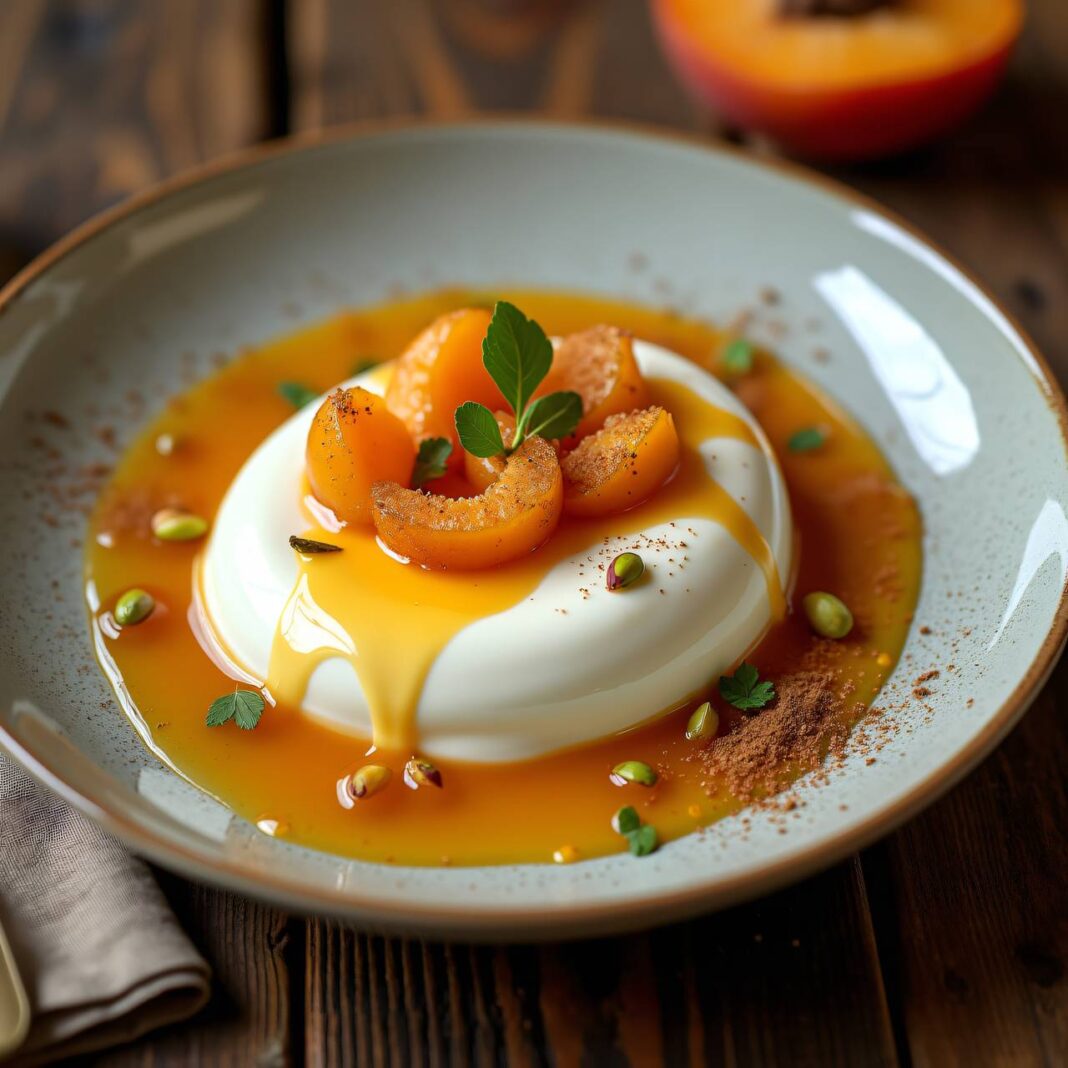 Eine erfrischende Joghurtcreme, serviert mit einem süßen Aprikosenpüree und bestreut mit gehackten Pistazien.