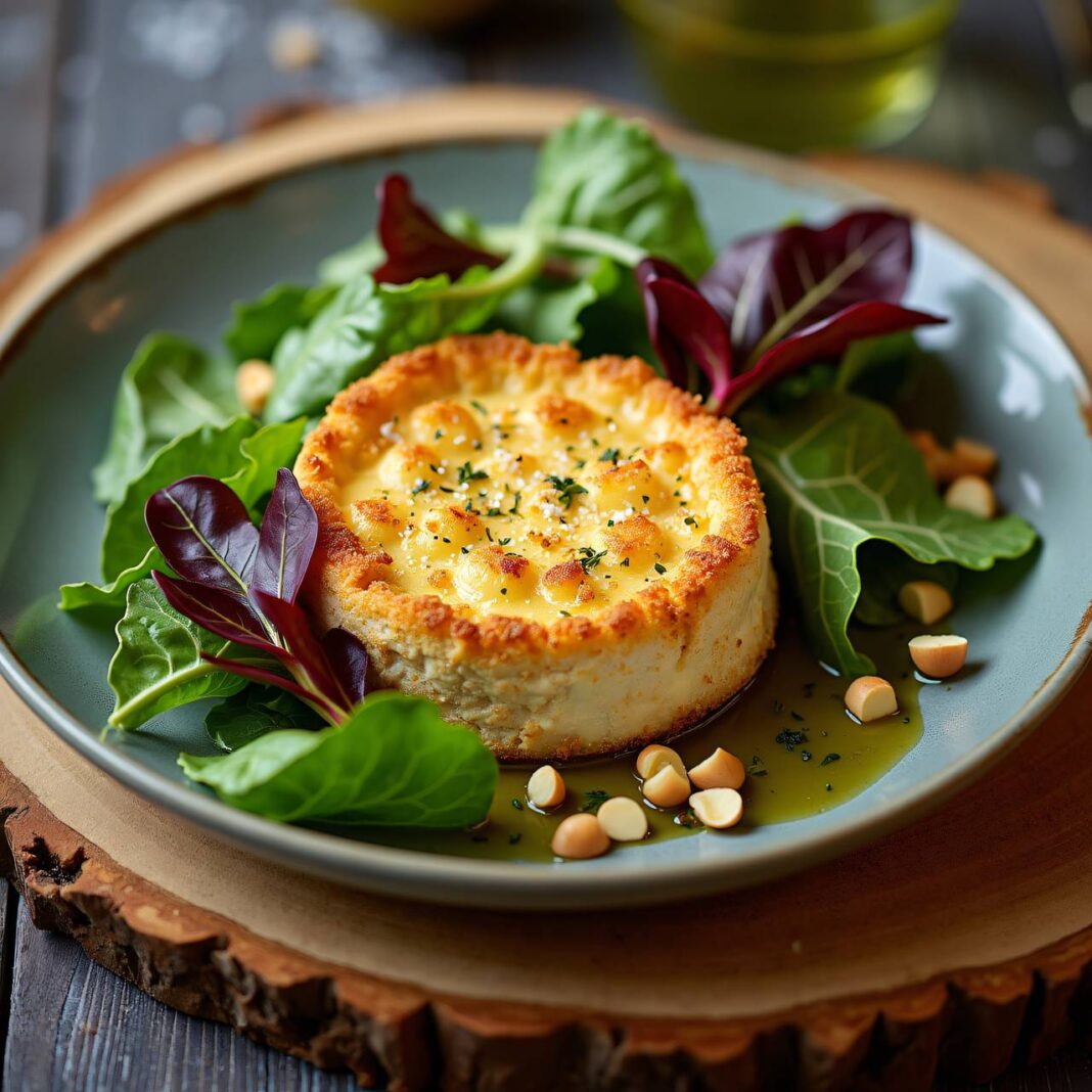 Ein köstliches Rezept für Käse im Haselnussmantel, serviert mit einem frischen gemischten Blattsalat.