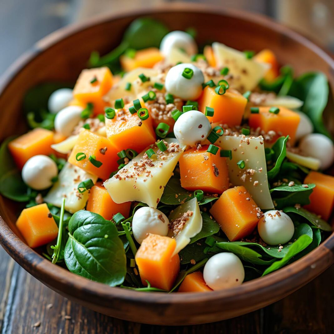 Ein erfrischender Käse-Melonen-Salat mit einer leckeren Rosa-Pfeffer-Sauce, perfekt für eine Low Carb Ernährung.