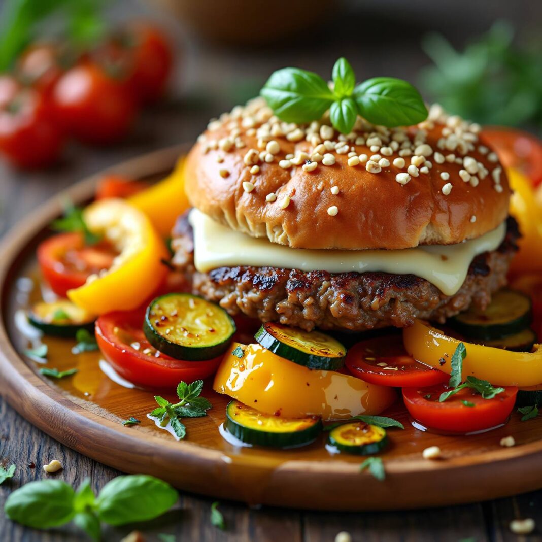 Ein herzhaftes Rezept für Käse-Nuss-Burger serviert auf einem Bett von köstlichem Ratatouille.
