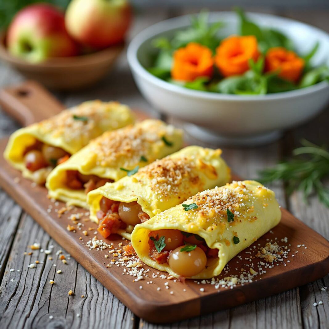 Käse-Omeletten gefüllt mit einer köstlichen Mischung aus Lauch, Schinken und Zwiebeln, serviert mit einem frischen Karotten-Apfel-Salat.
