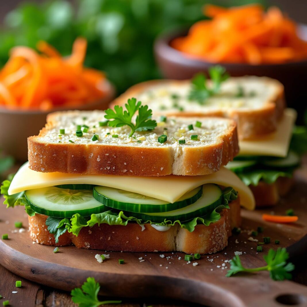 Leckere Käse-Schnittlauch-Sandwiches, serviert mit einem frischen Karottensalat.