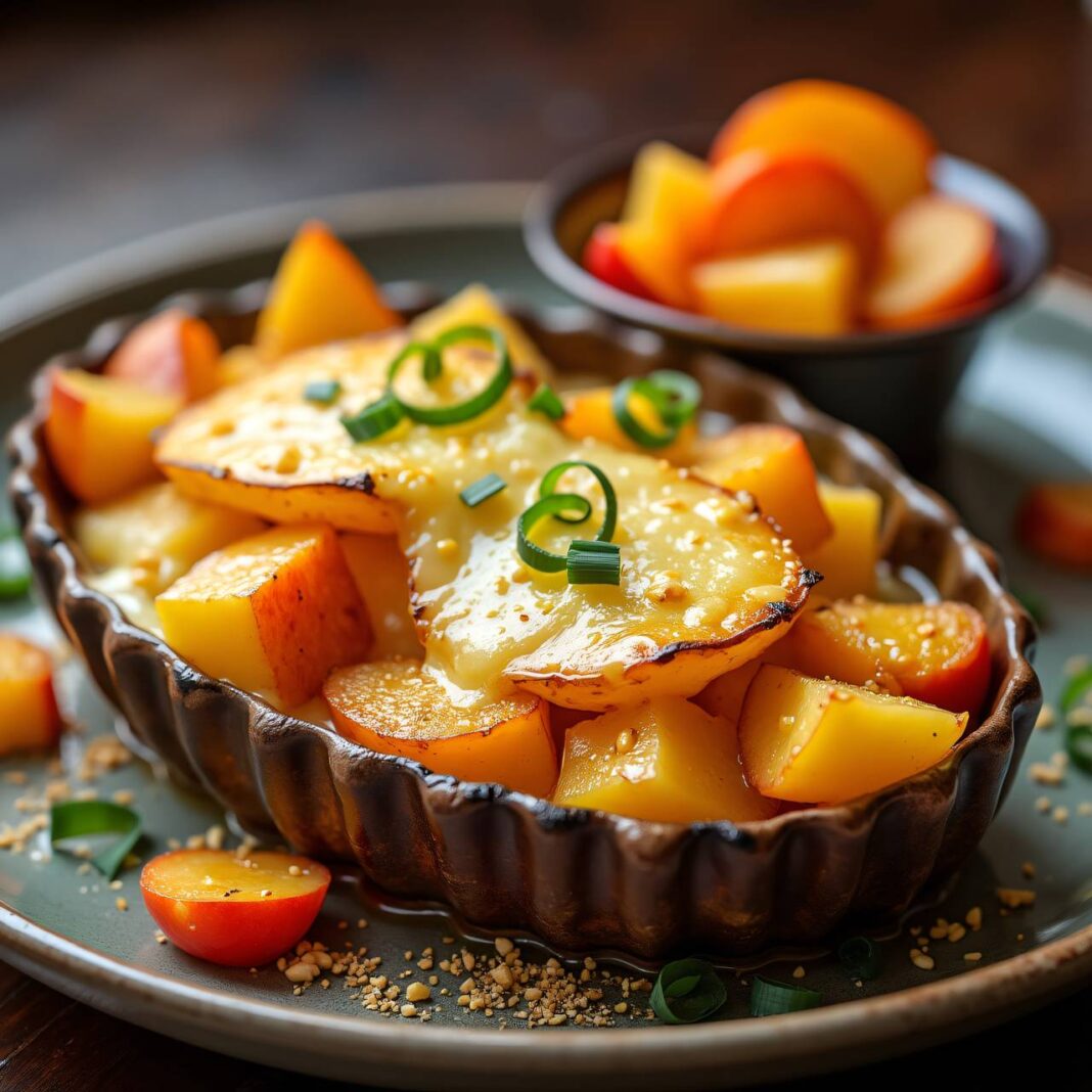 Ein leckeres und herzhaftes Gericht aus Käsekartoffeln, serviert mit einem fruchtigen Kompott.