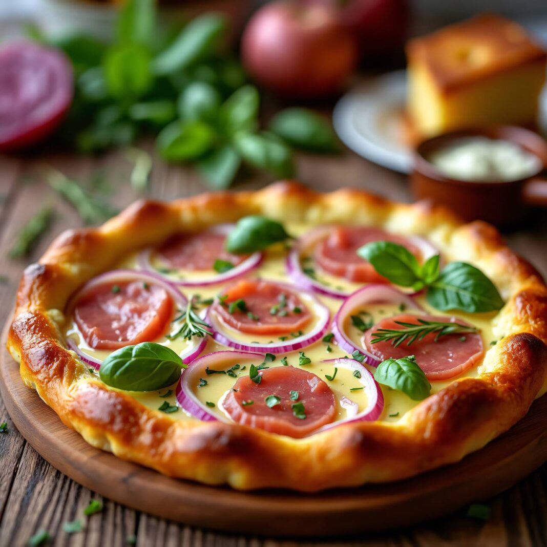 Ein köstlicher Käsekuchen vom Blech mit Ziegenkäse, Rohschinken und frischen Kräutern.