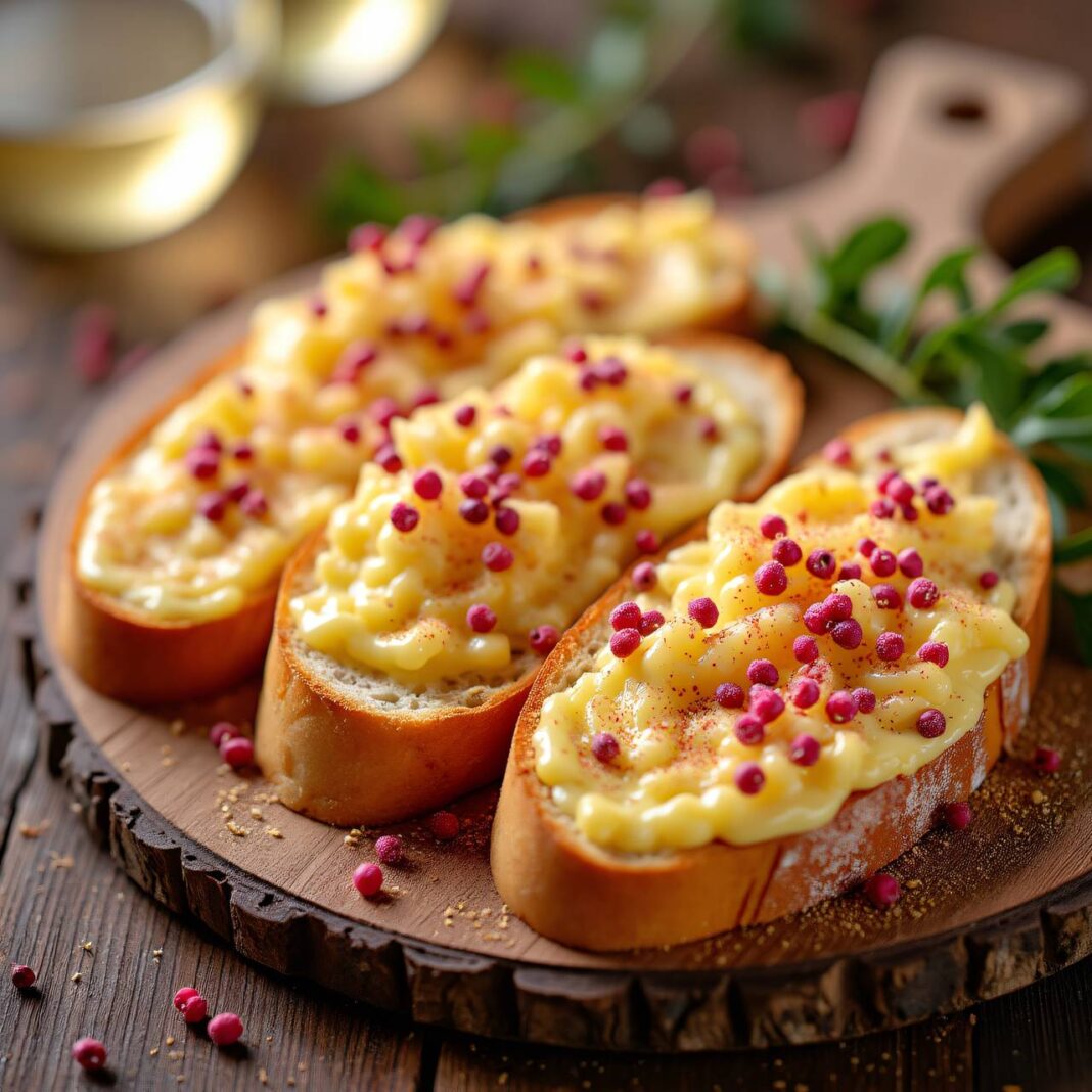 Ein köstliches Rezept für Käseschnitten, die mit einer Mischung aus Käse, Ei und Rosa Pfeffer zubereitet und goldbraun gebraten werden.