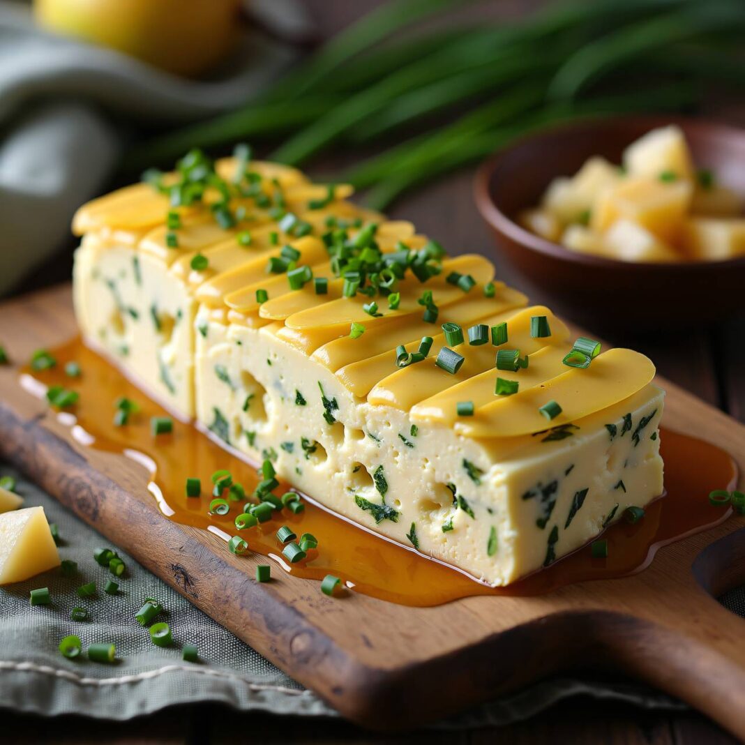 Eine köstliche Käseterrine aus Lauch, Hüttenkäse und frischen Kräutern, serviert mit einer feinen Sauce.