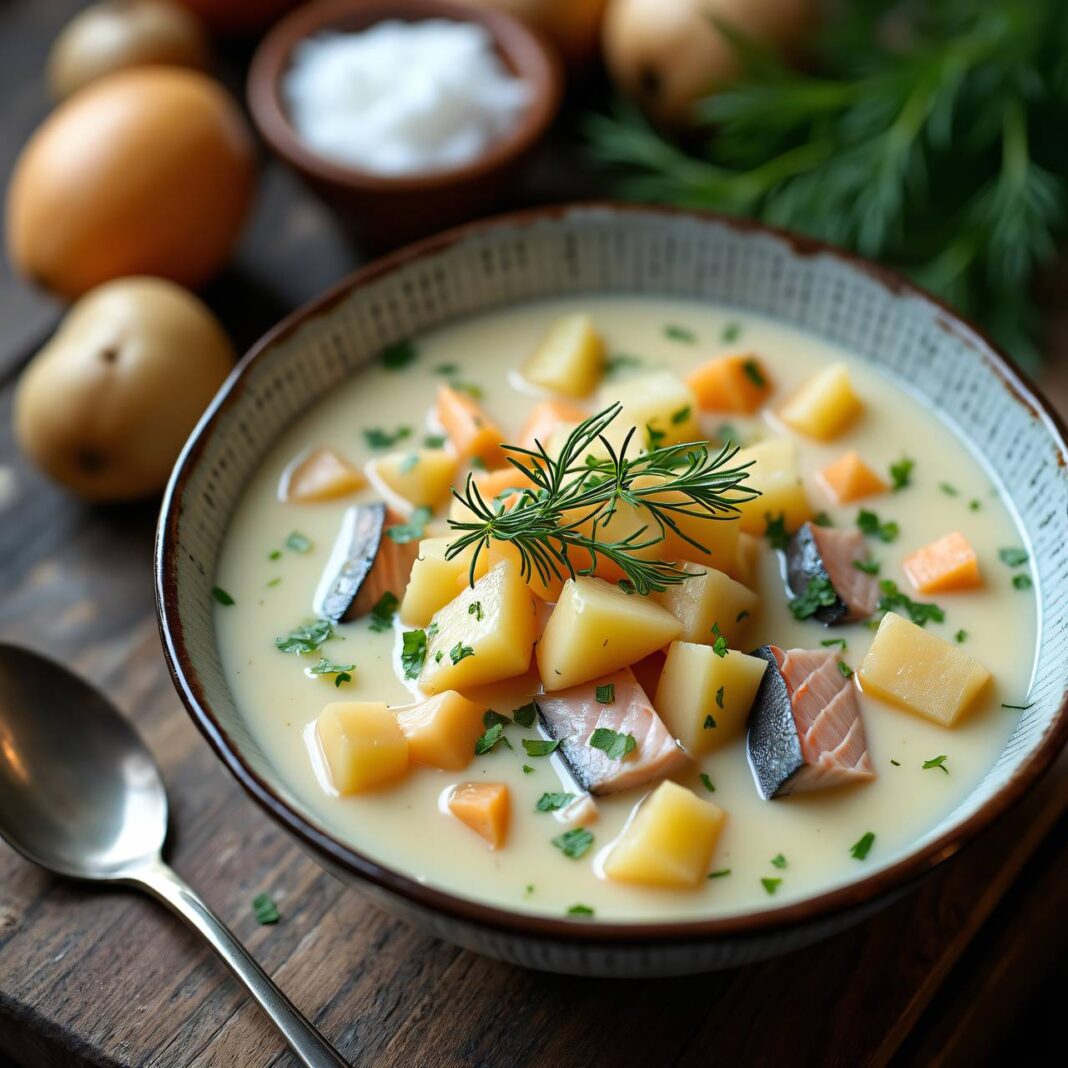 Eine traditionelle finnische Fischsuppe, die mit frischen Zutaten zubereitet wird.