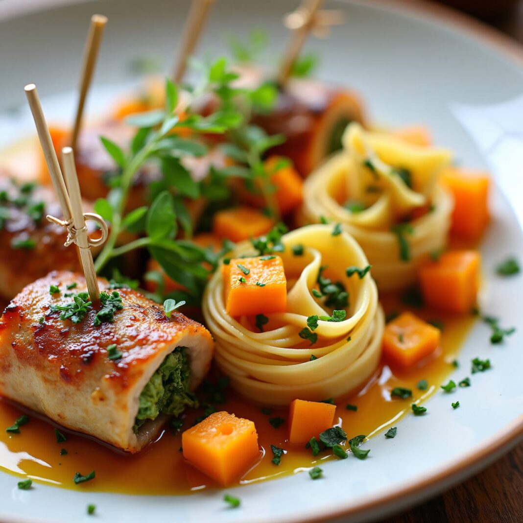Ein köstliches Rezept für Kalbfleischröllchen gefüllt mit Estragon und serviert mit Kürbis-Taglierini.