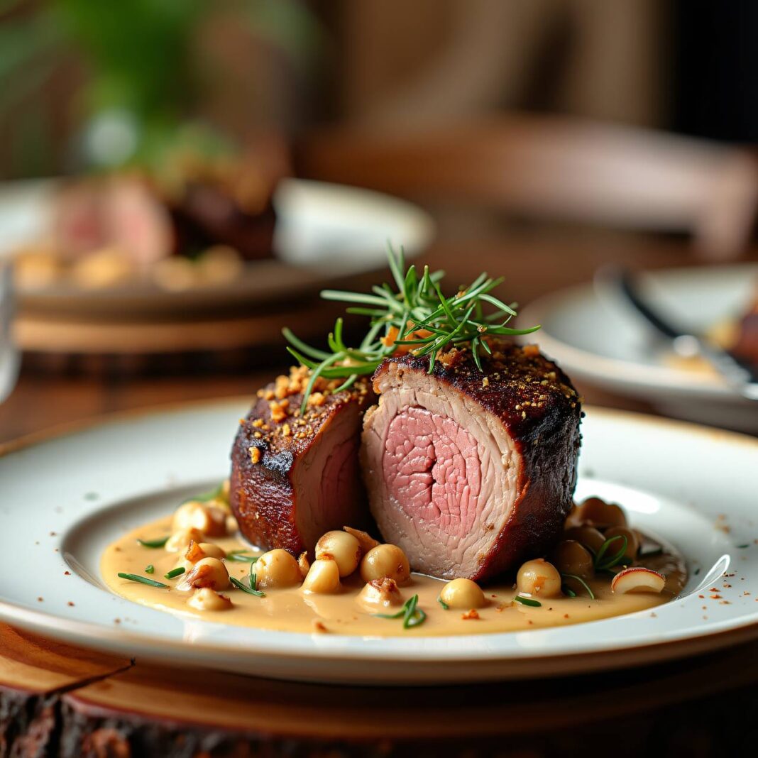 Ein zartes Kalbsbratenrezept, serviert mit einer köstlichen Nuss-Sauce.