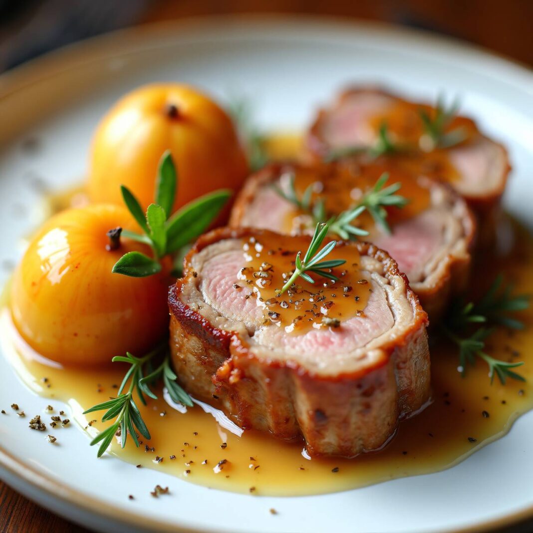 Ein zartes Kalbsnussgericht, serviert mit einer feinen Apfelsauce und Dampfäpfeln.