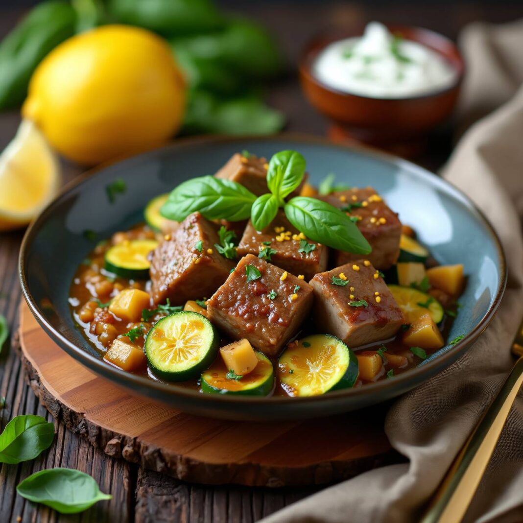 Ein köstliches Kalbsragout mit Zucchini und Zitronenschale, das durch die Zugabe von Crème fraîche eine cremige Note erhält.