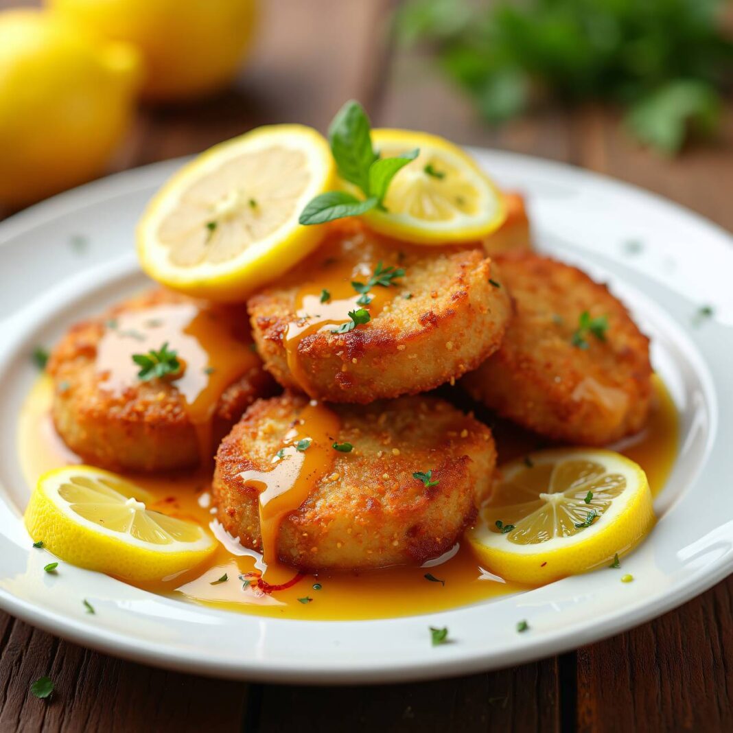 - Richten Sie die Schnitzel mit der Sauce an und garnieren Sie das Gericht mit Zitronenscheiben.