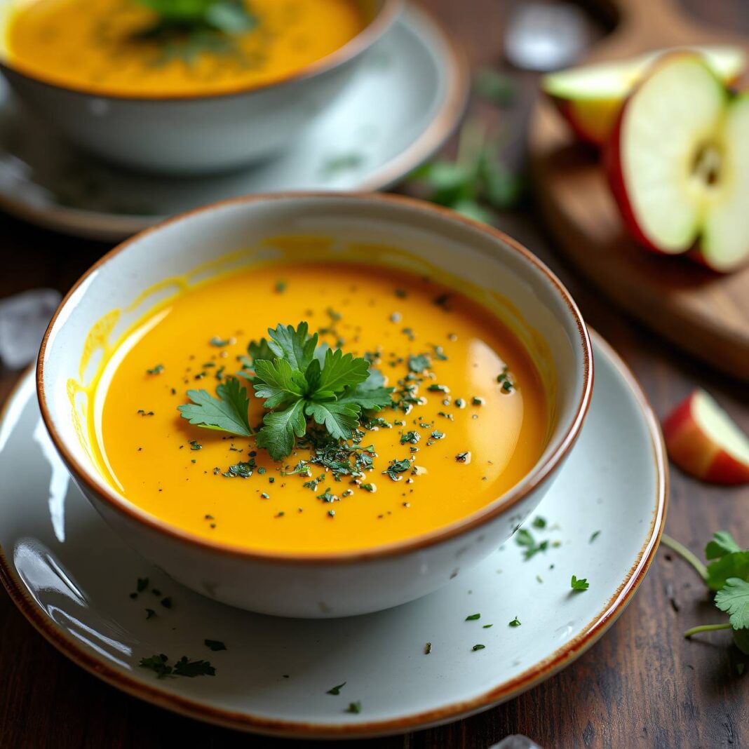 Eine erfrischende kalte Suppe mit einer exotischen Note von Curry und Ingwer, ideal für heiße Tage.
