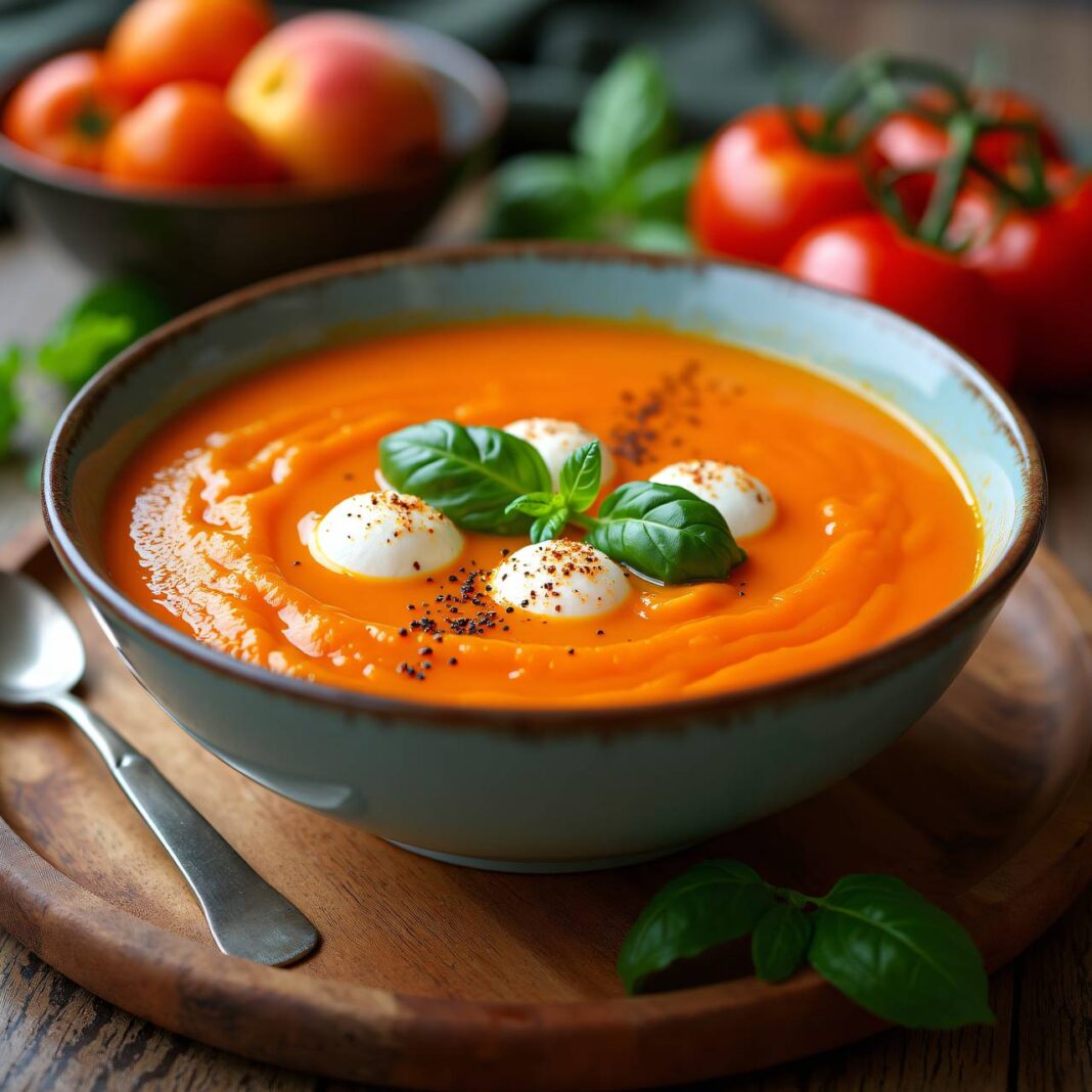 Eine erfrischende kalte Suppe aus Tomaten und Aprikosen, ideal für warme Tage.