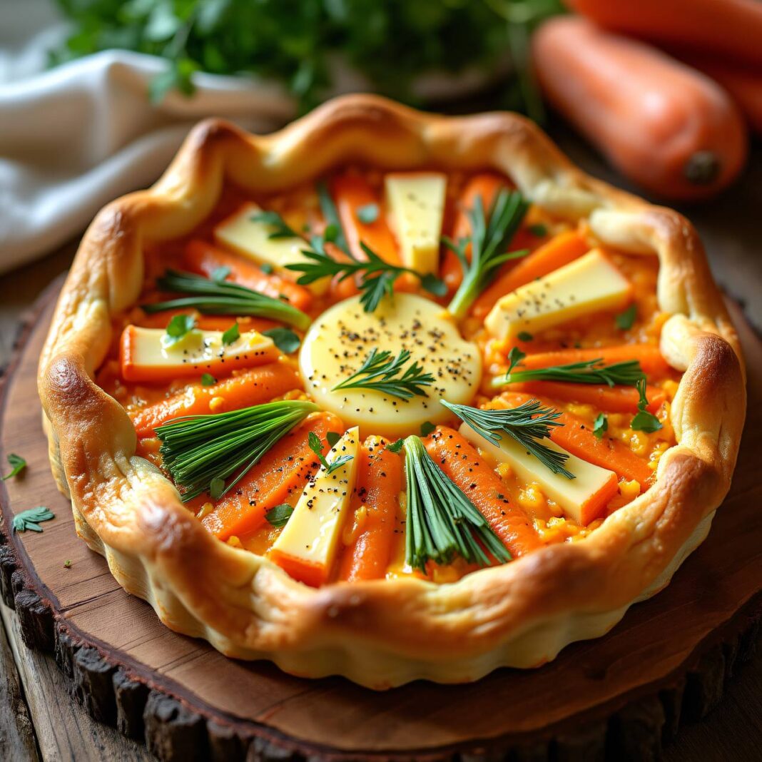 Ein köstlicher Blechkuchen mit Karotten, Lauch und Camembert, ideal für jede Gelegenheit.