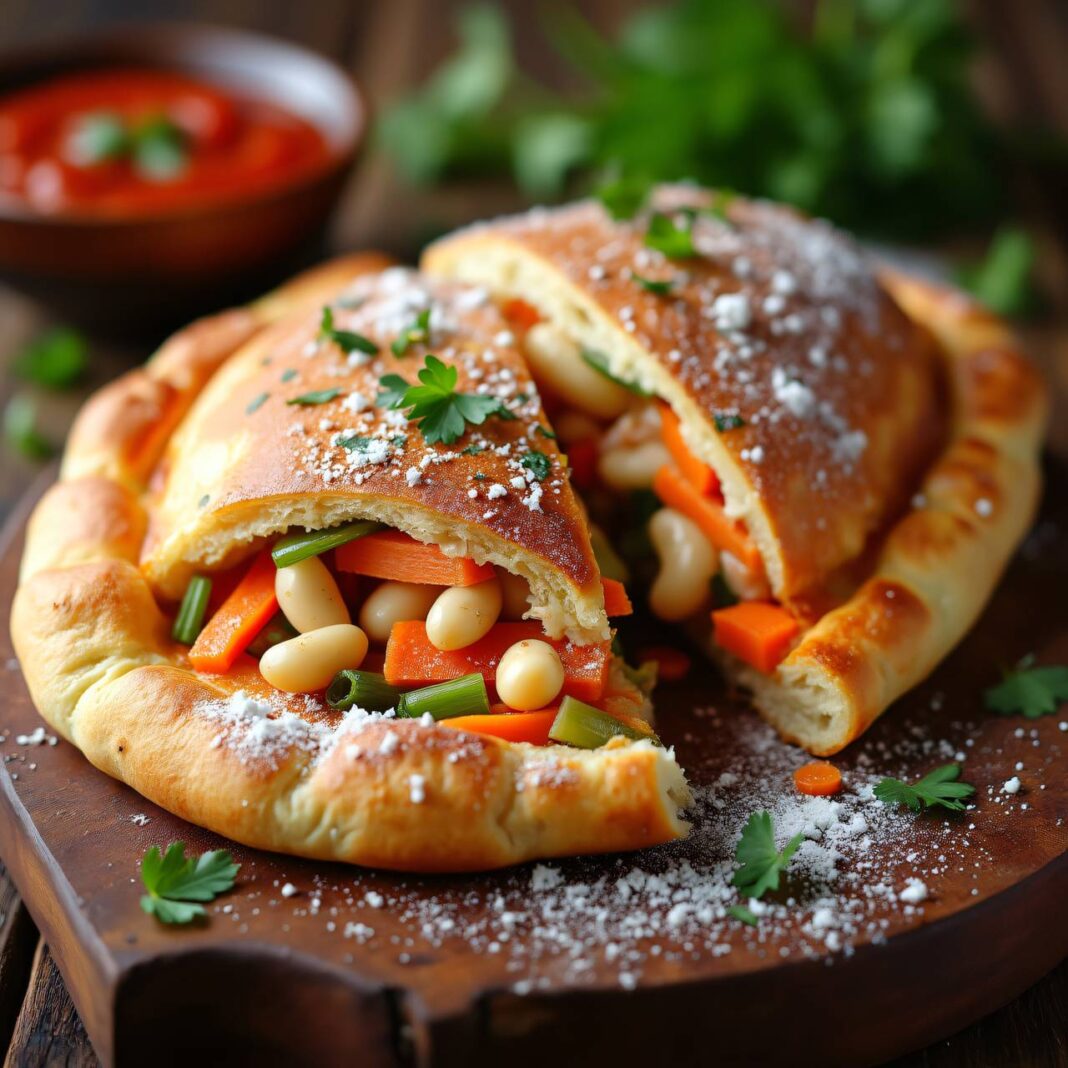Eine köstliche Calzone gefüllt mit Karotten, Sellerie, Lauch und Mozzarella.