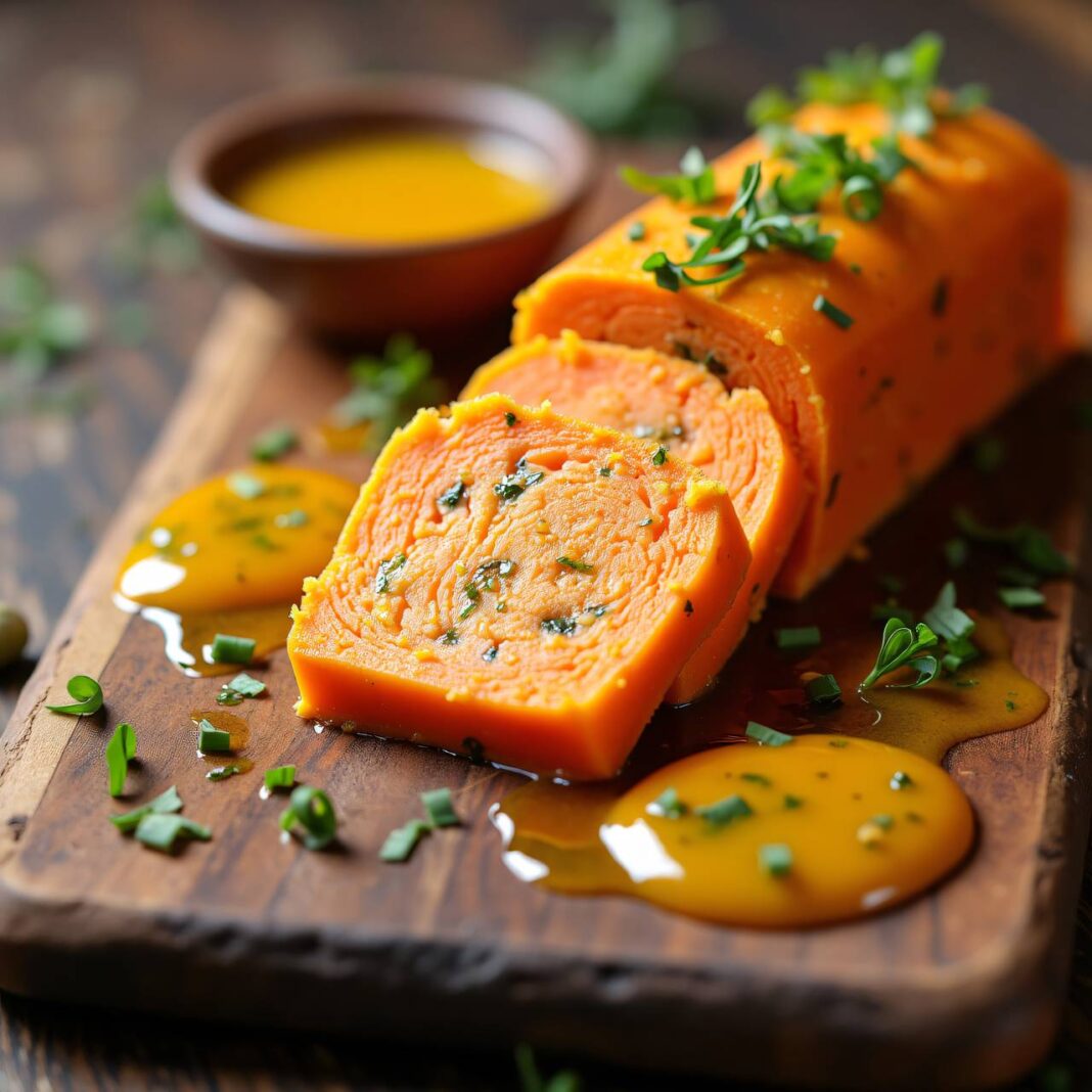 Eine köstliche Karotten-Terrine, serviert mit einer aromatischen Haselnuss-Vinaigrette.