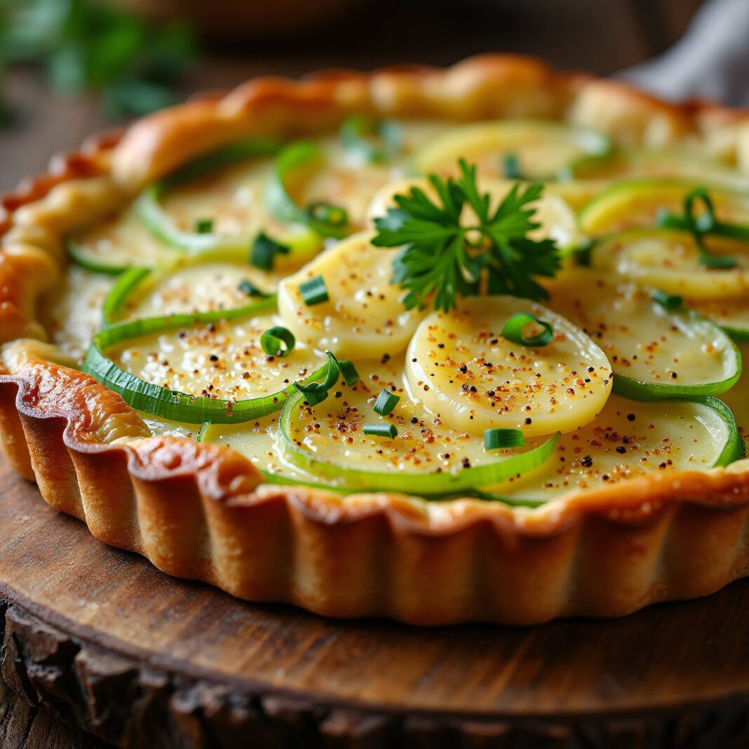 Ein köstlicher Fladen aus Kartoffeln und Lauch, der im Ofen goldbraun gebacken wird.