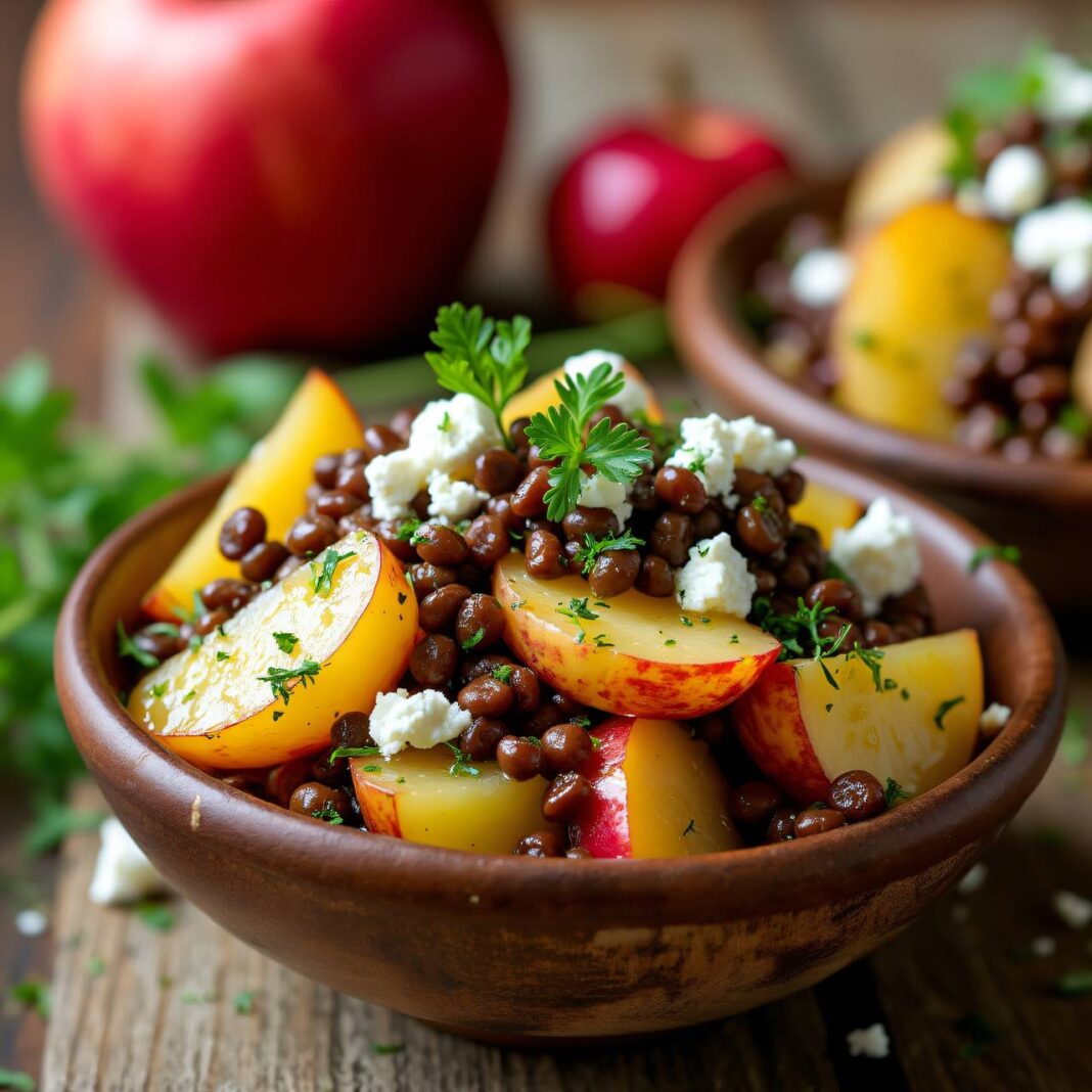 Ein köstlicher Kartoffel-Linsen-Salat mit einer erfrischenden Apfel-Vinaigrette.