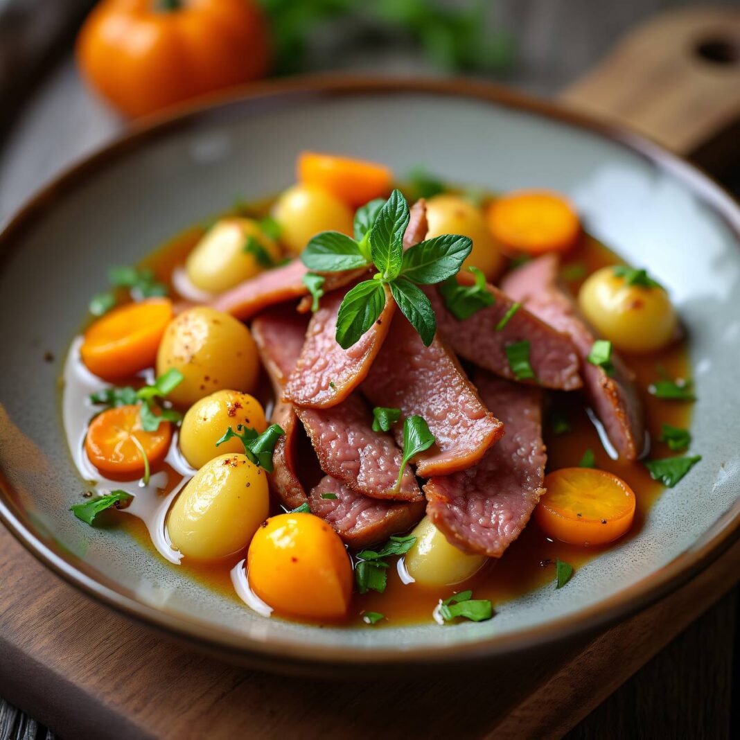 Ein herzhaftes Gericht mit geschnetzeltem Kalbfleisch, kleinen Raclette-Kartoffeln und Kürbis, serviert mit saurer Sahne und Schnittlauch.