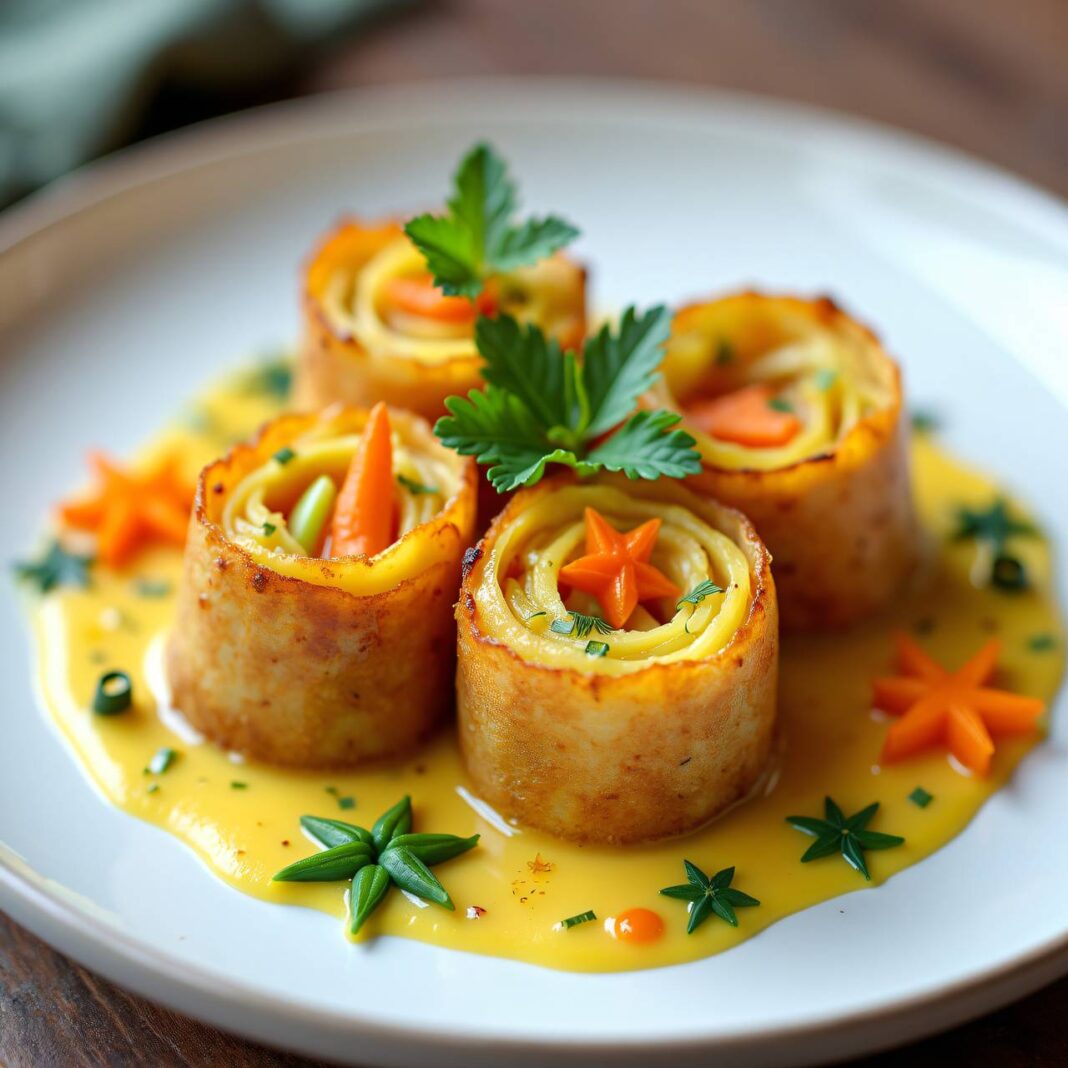 Ein köstliches Rezept für Kartoffel-Timbales, geschichtet mit Gemüse und serviert mit einer cremigen Sauce.