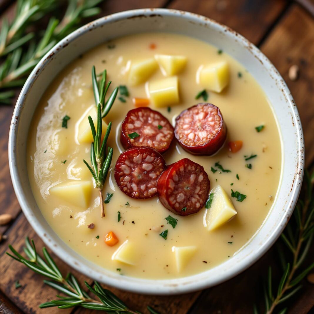 Eine cremige Kartoffelsuppe mit Rauchwürstchen, perfekt für kalte Tage.