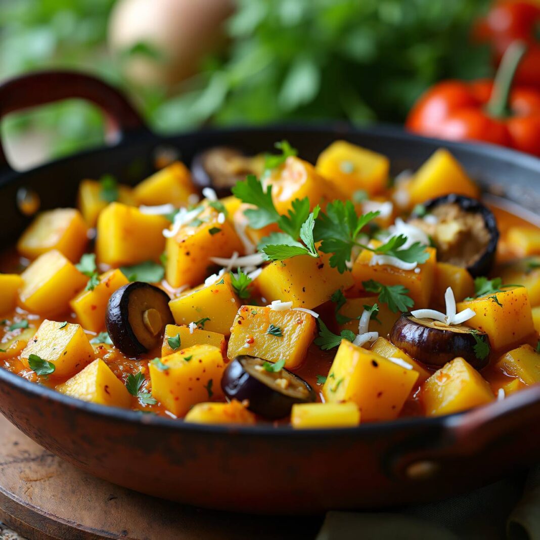 Ein einfaches und leckeres Kartoffelcurry, das in einer Pfanne zubereitet wird.