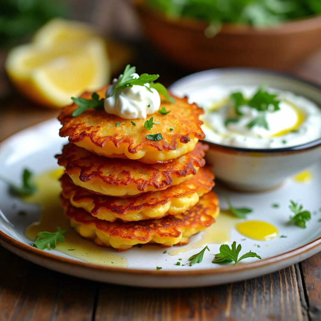 Leckere Kartoffelpuffer mit Frischkäse, serviert mit einer erfrischenden Joghurtsauce.