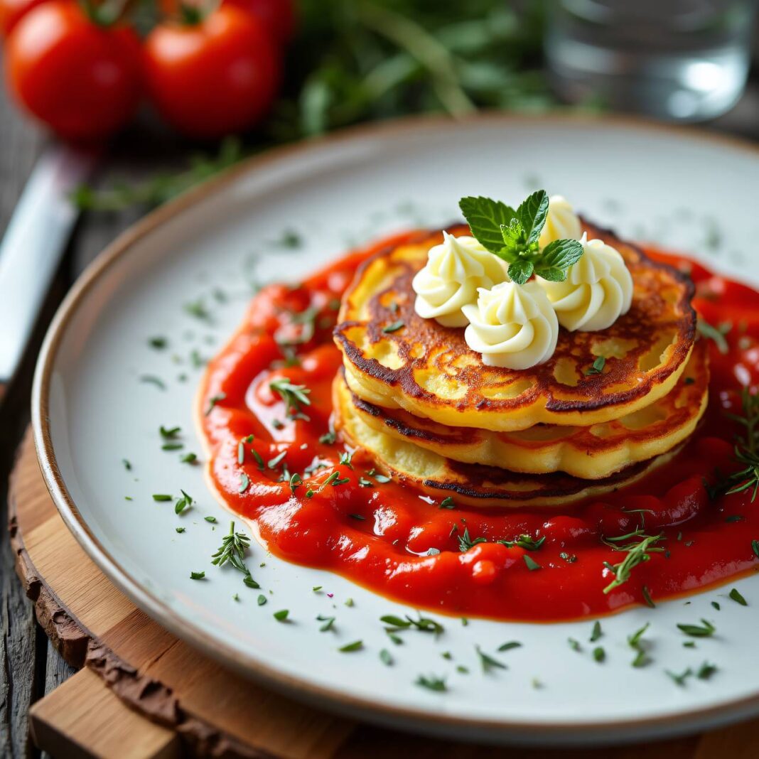 Anrichten: Servieren Sie die Kartoffelpuffer auf vorgewärmten Tellern. Geben Sie die Tomatensauce darüber und garnieren Sie das Gericht mit den Tête de Moine Scheiben und etwas frischem Thymian.